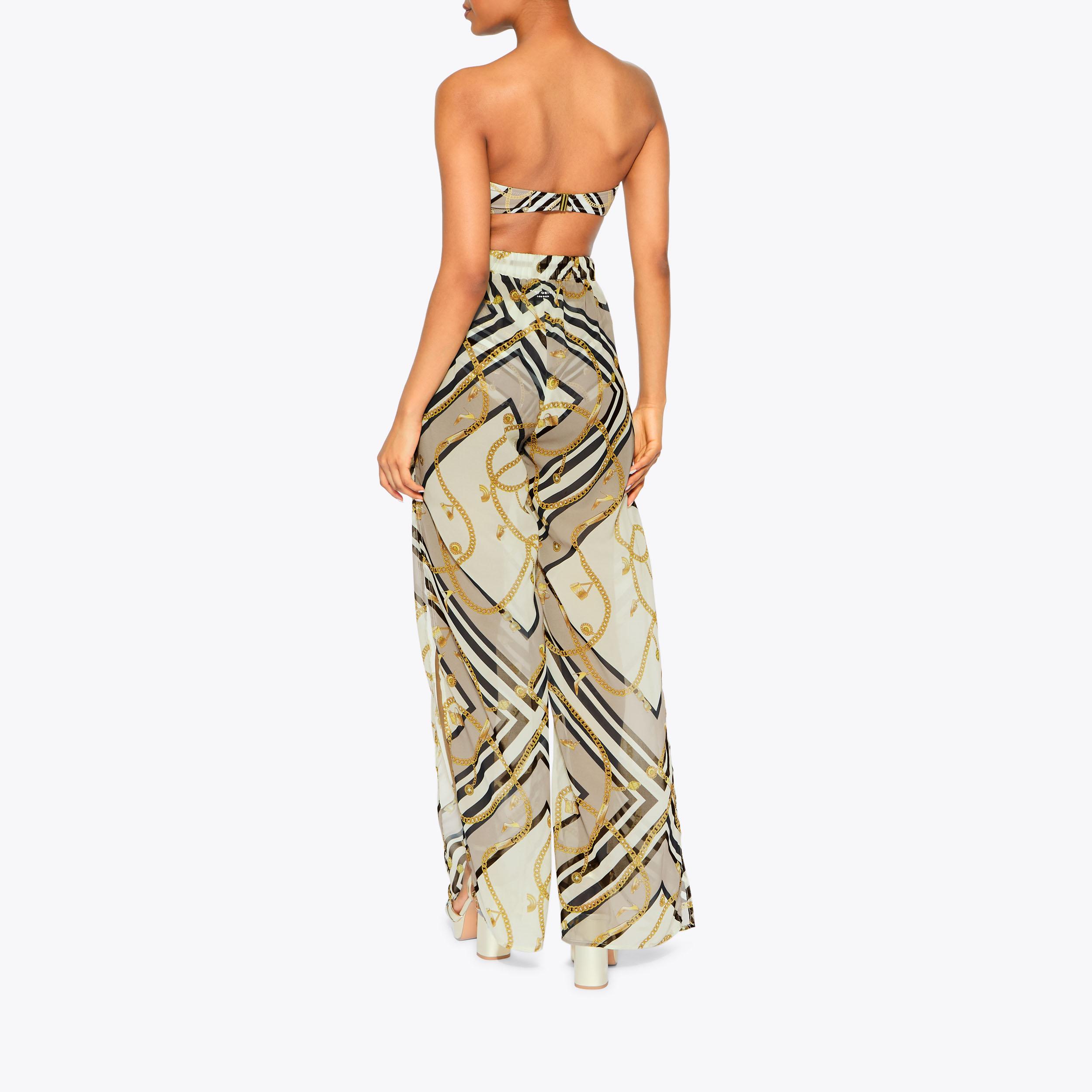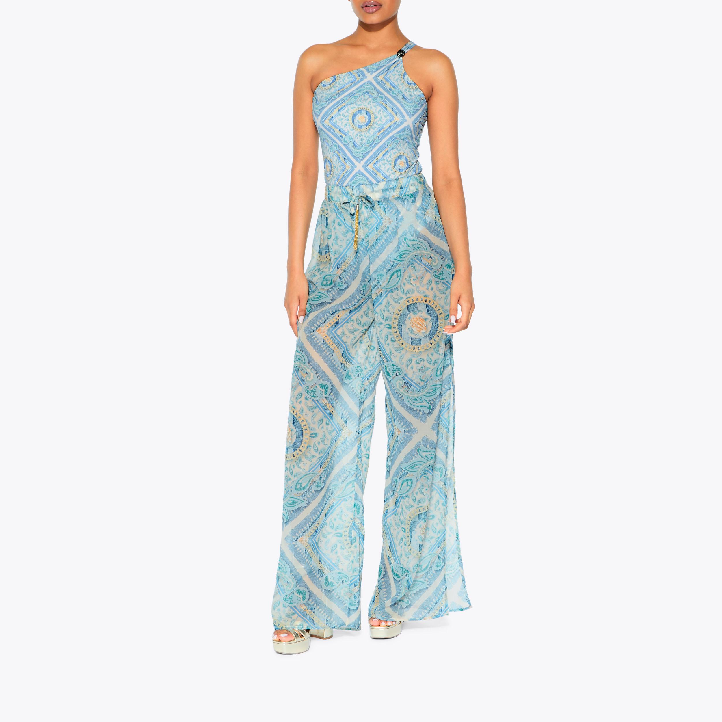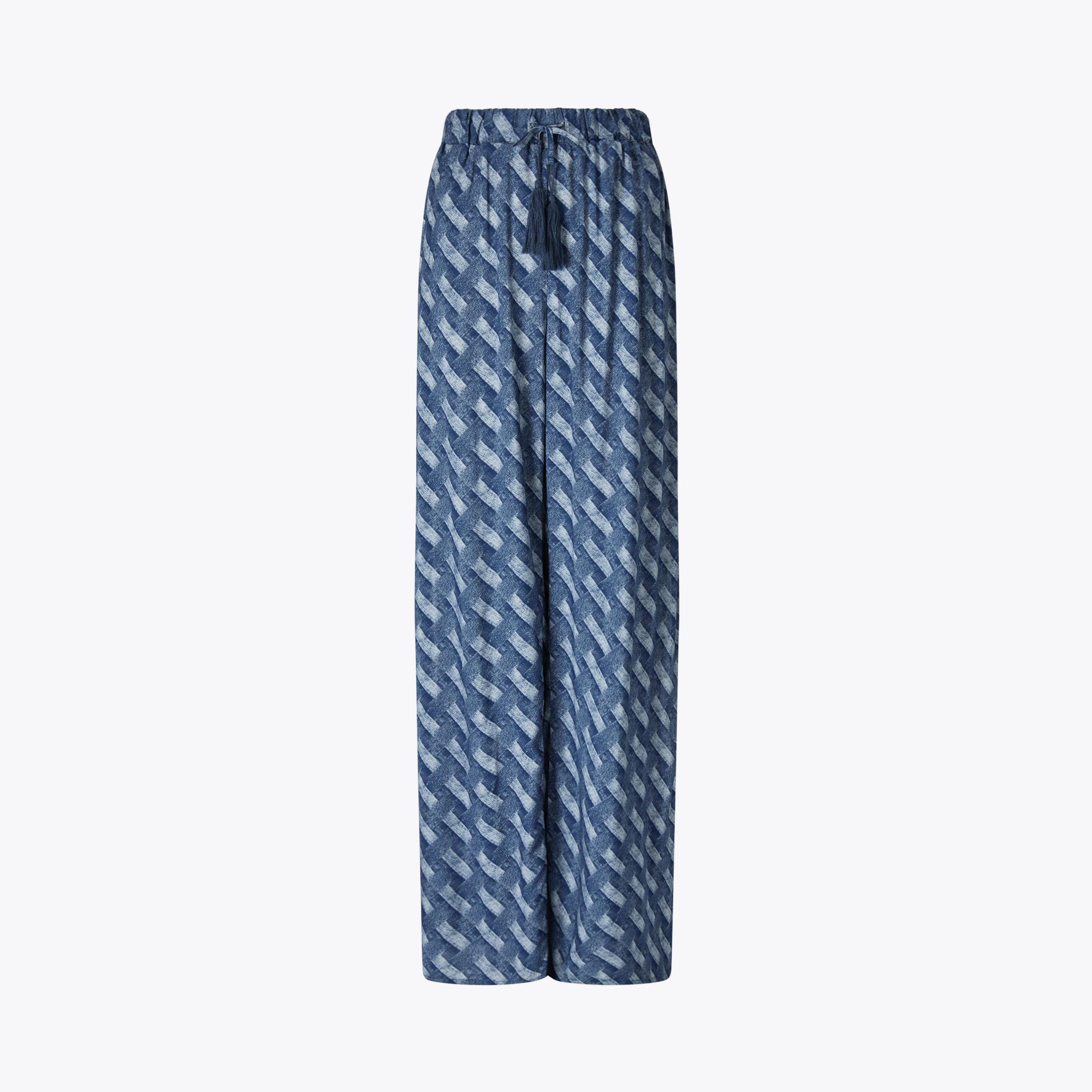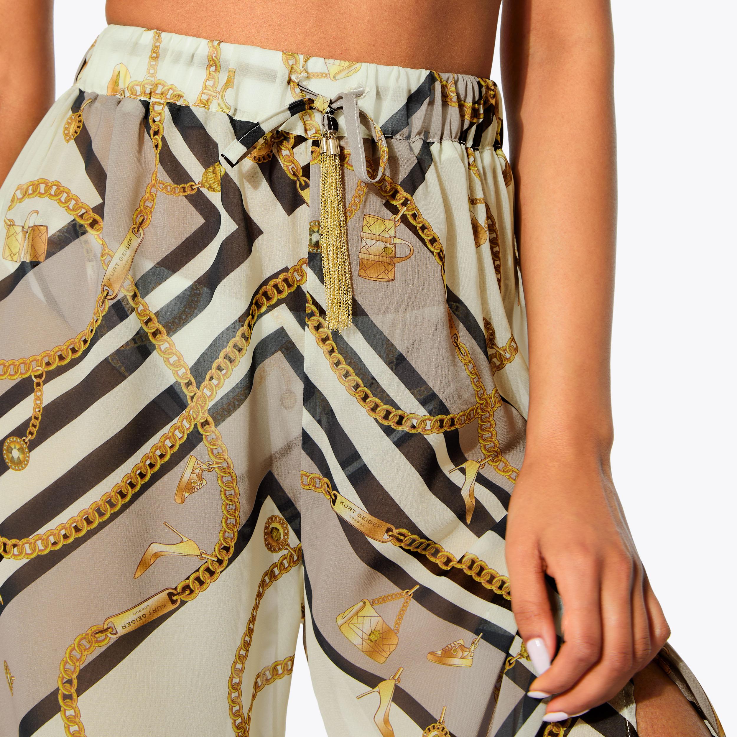 This pair of Resort Trousers are crafted from a blue paisley chain printed fabric. The waistband is elasticated with a gold chain tassel detail.
