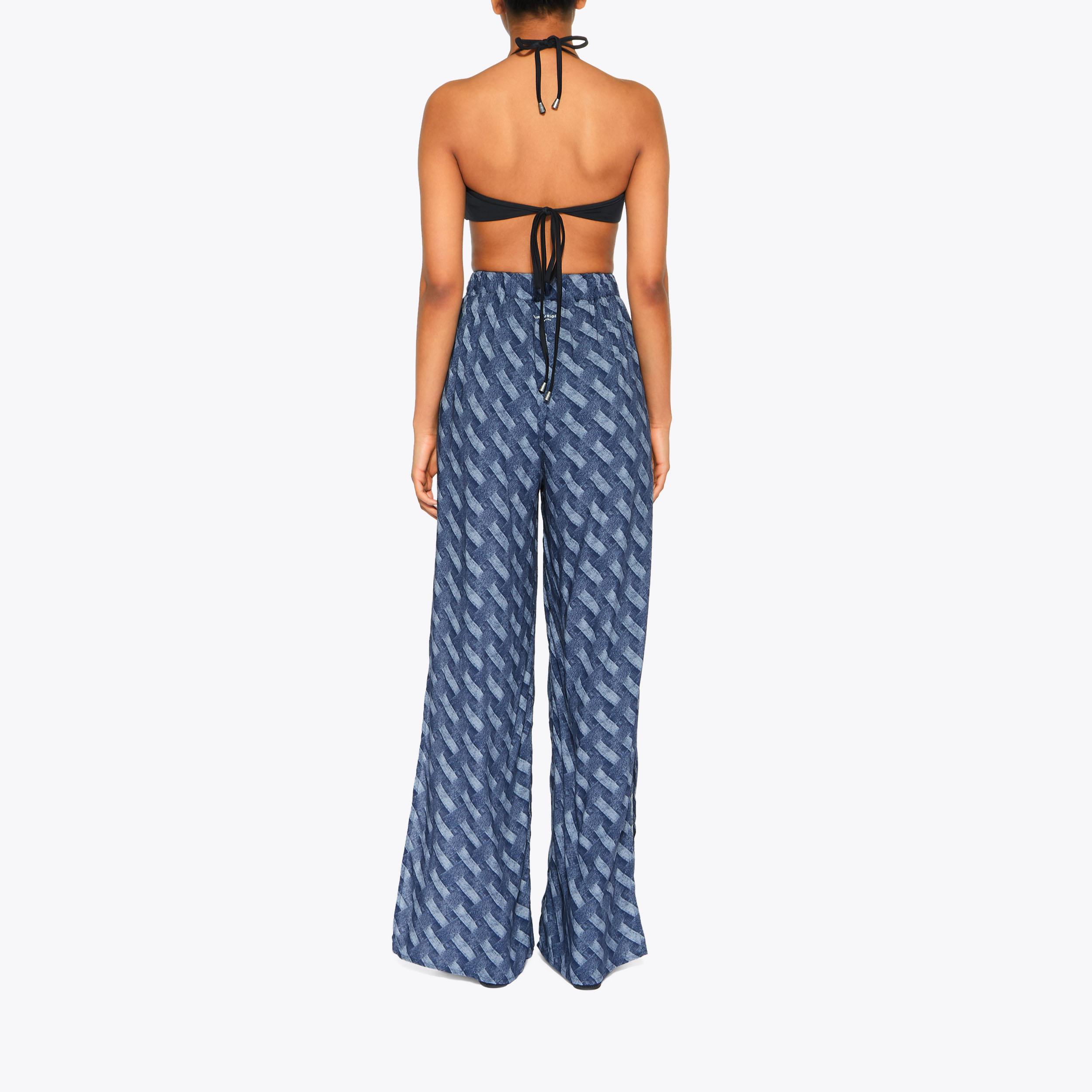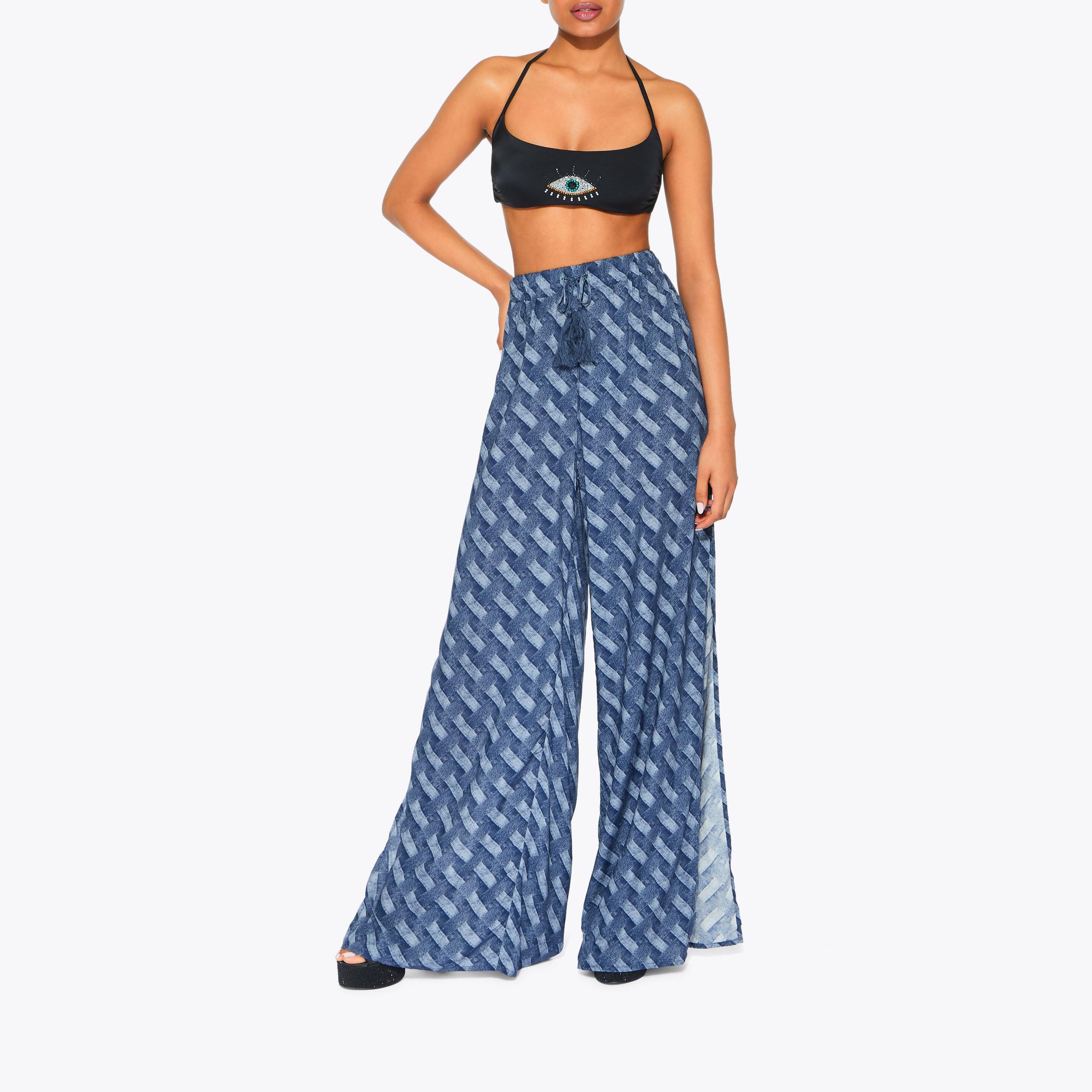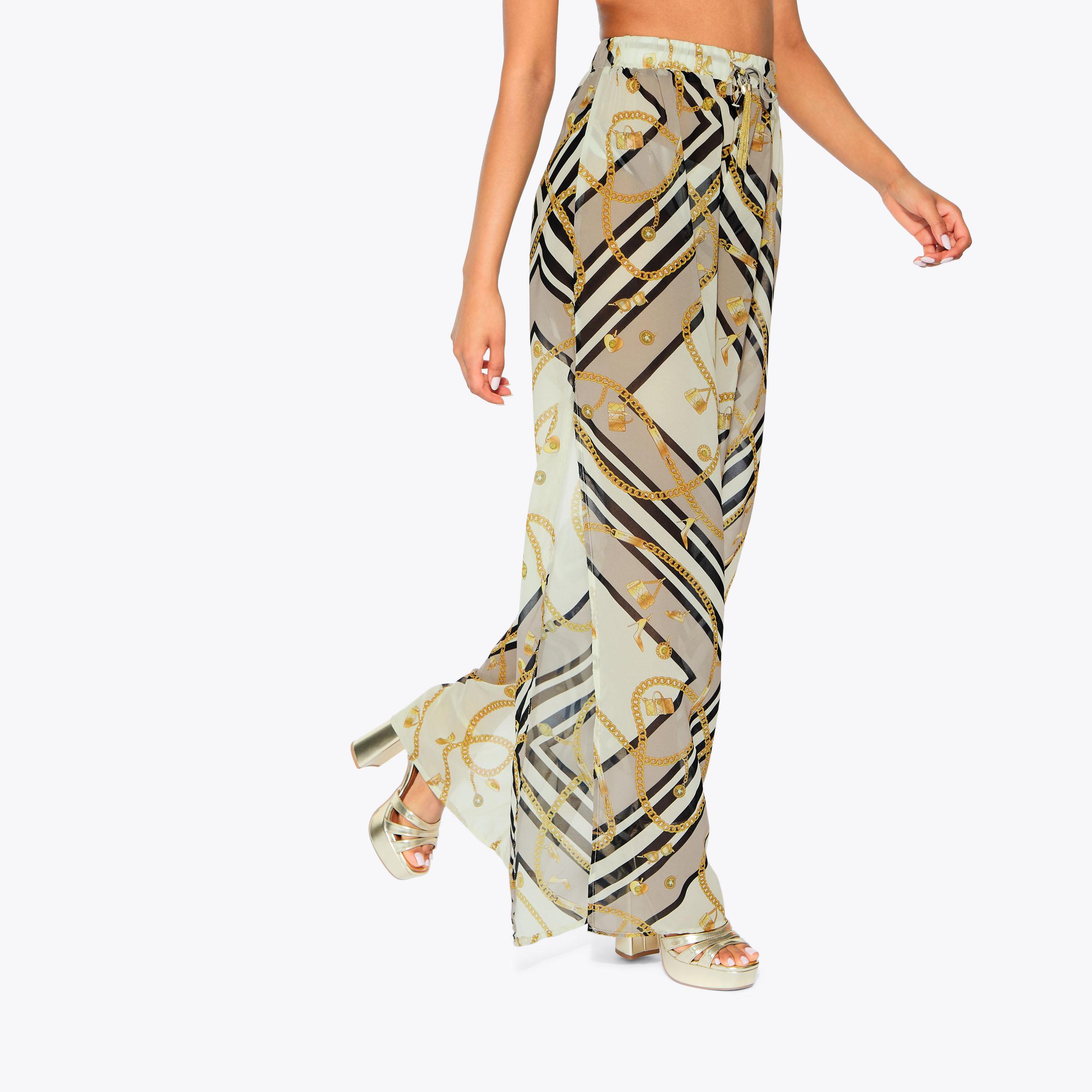This pair of Resort Trousers are crafted from a blue paisley chain printed fabric. The waistband is elasticated with a gold chain tassel detail.