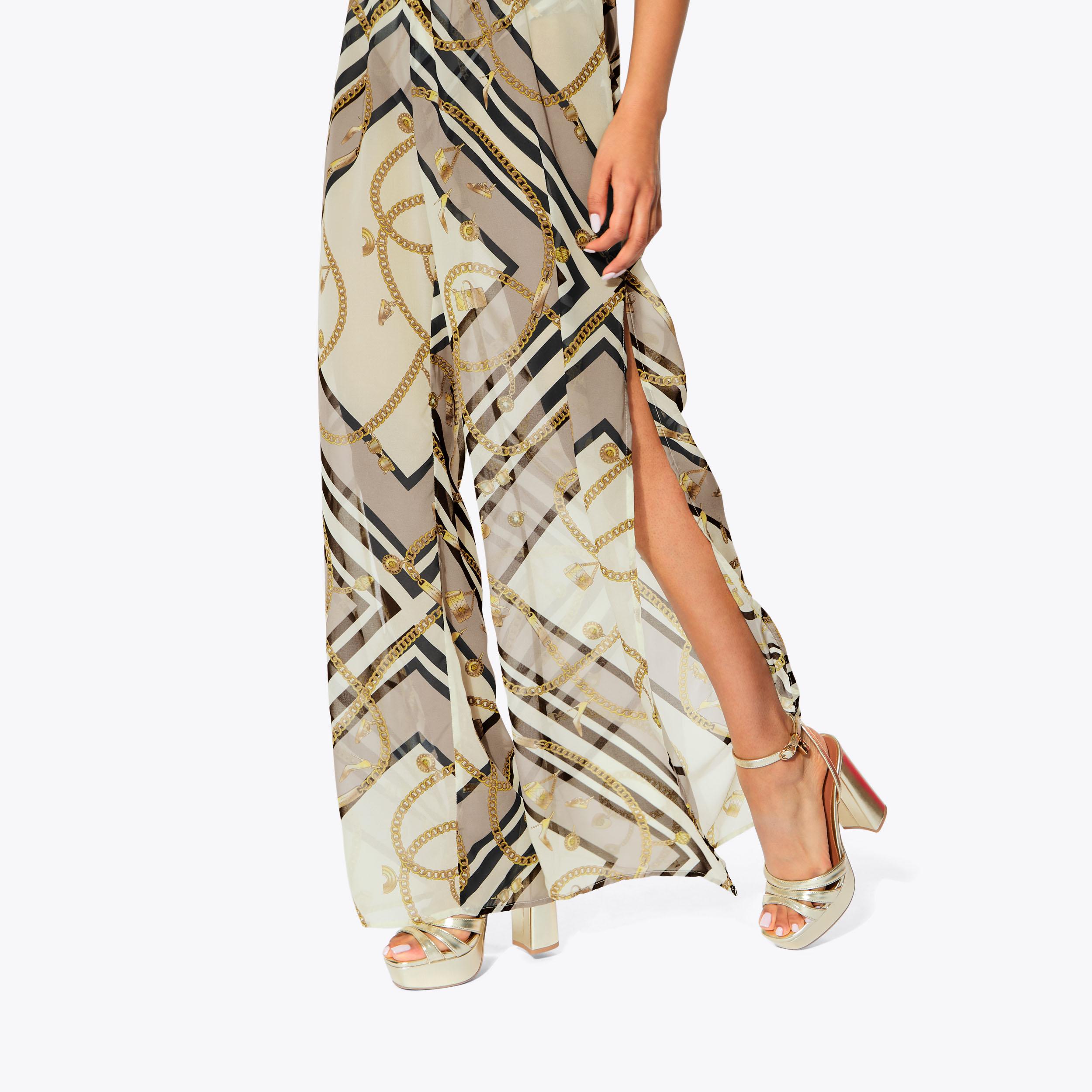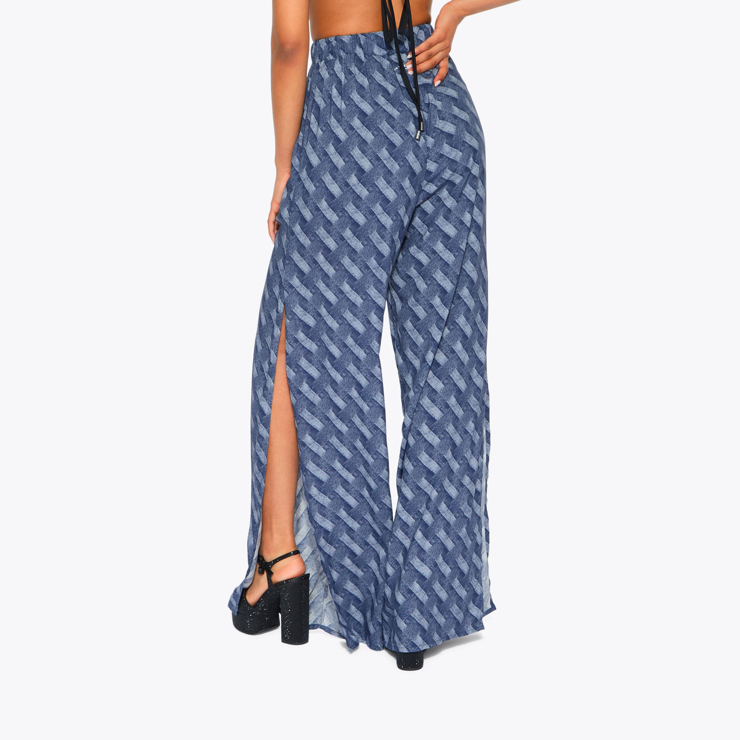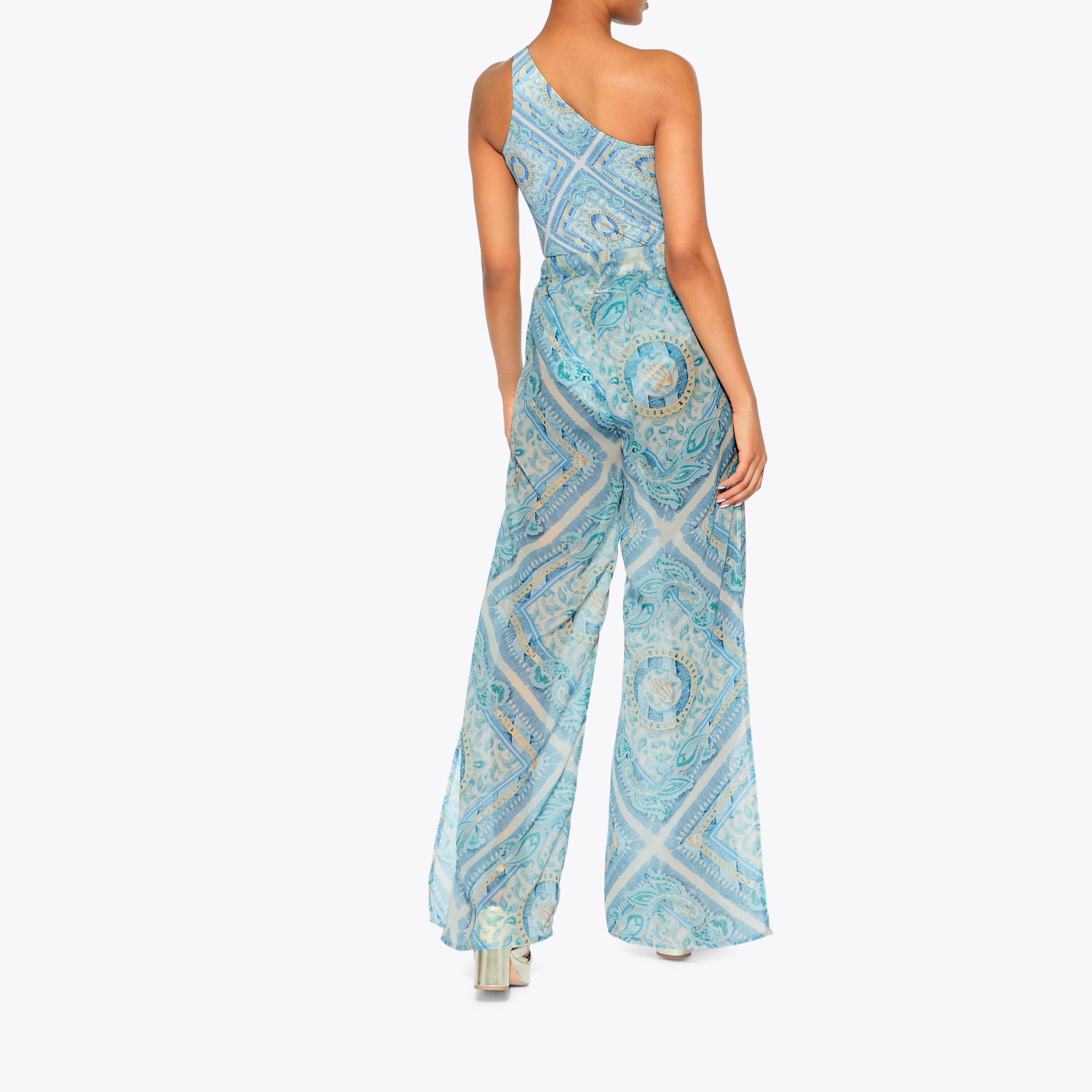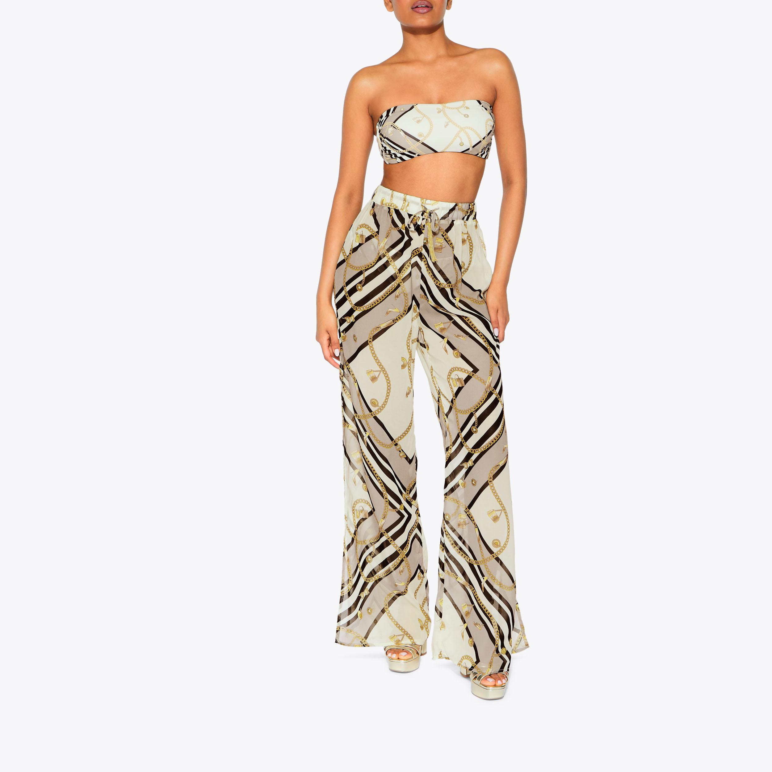 This pair of Resort Trousers are crafted from a blue paisley chain printed fabric. The waistband is elasticated with a gold chain tassel detail.